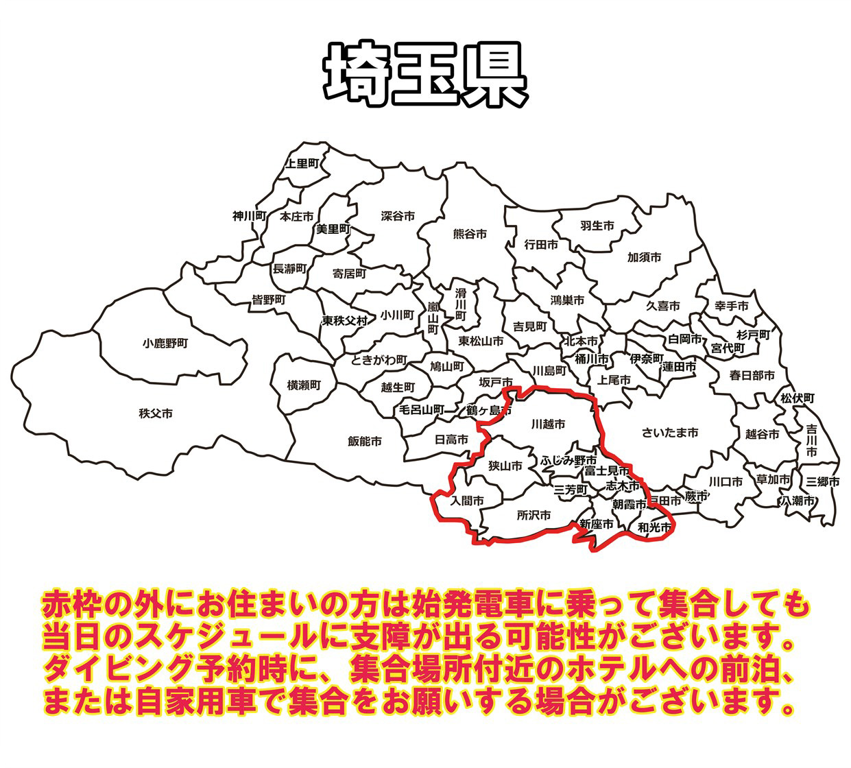 例)埼玉西部・北部にお住まいの人は川越駅集合、埼玉東部・南部エリアにお住まいの方は新座駅集合など