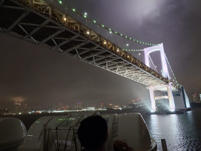 船はいつものように出港しまして、レインボーブリッジを下から見上げながら「行ってきま〜す🌈」という形で橋を見送って就寝💤