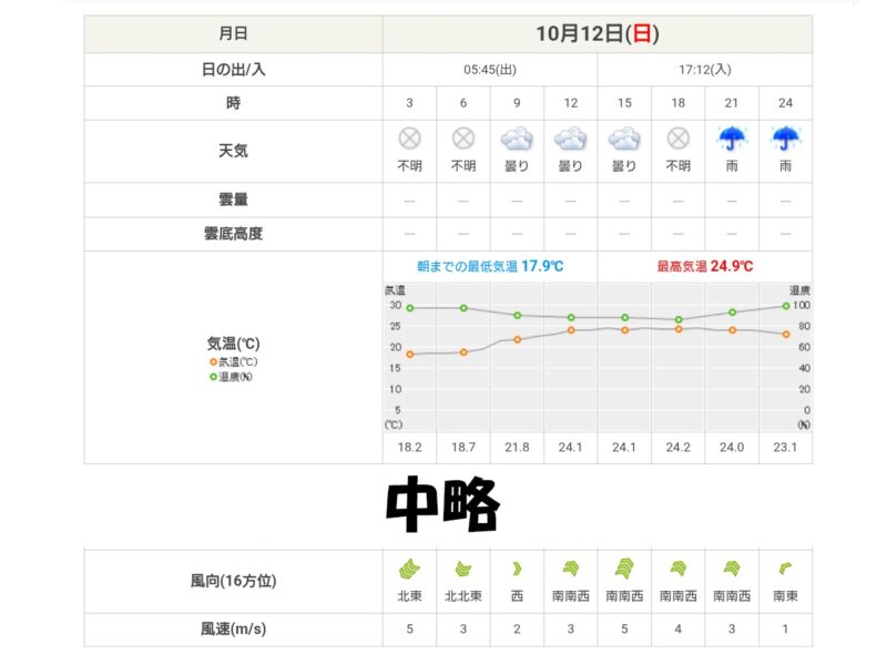 実際に天気予報を確認してみると、1日目は最大でも風速5m程度、2日目の台風が当たるという日でも最大でも風速10m前後・・・