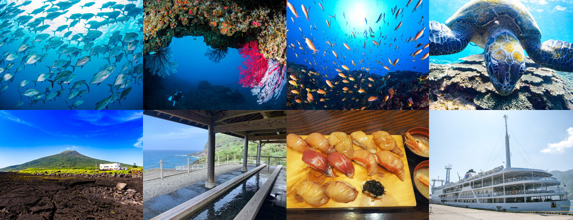 八丈島は黒潮の通り道に位置し、抜群の透明度を誇る「八丈ブルー」 の海が魅力です。暖かい潮が流れ込むため、日本列島本当付近には居ないカラフルな熱帯魚やウミガメなどの生物が豊富に見られます。