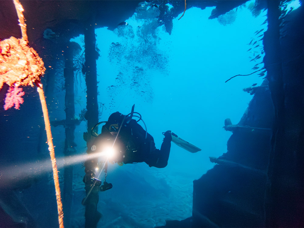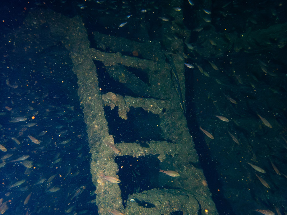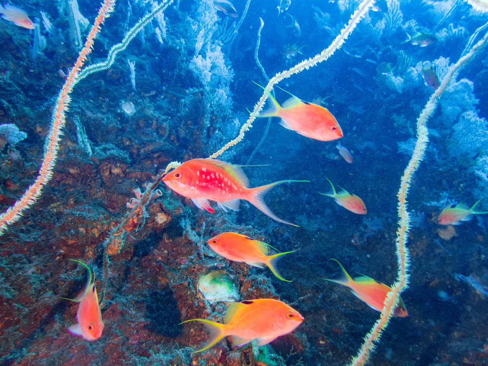 名物の沈船ポイントは全長80m級の迫力で、ソフトコーラルや群れがびっしり付き、まるで海中遺跡。