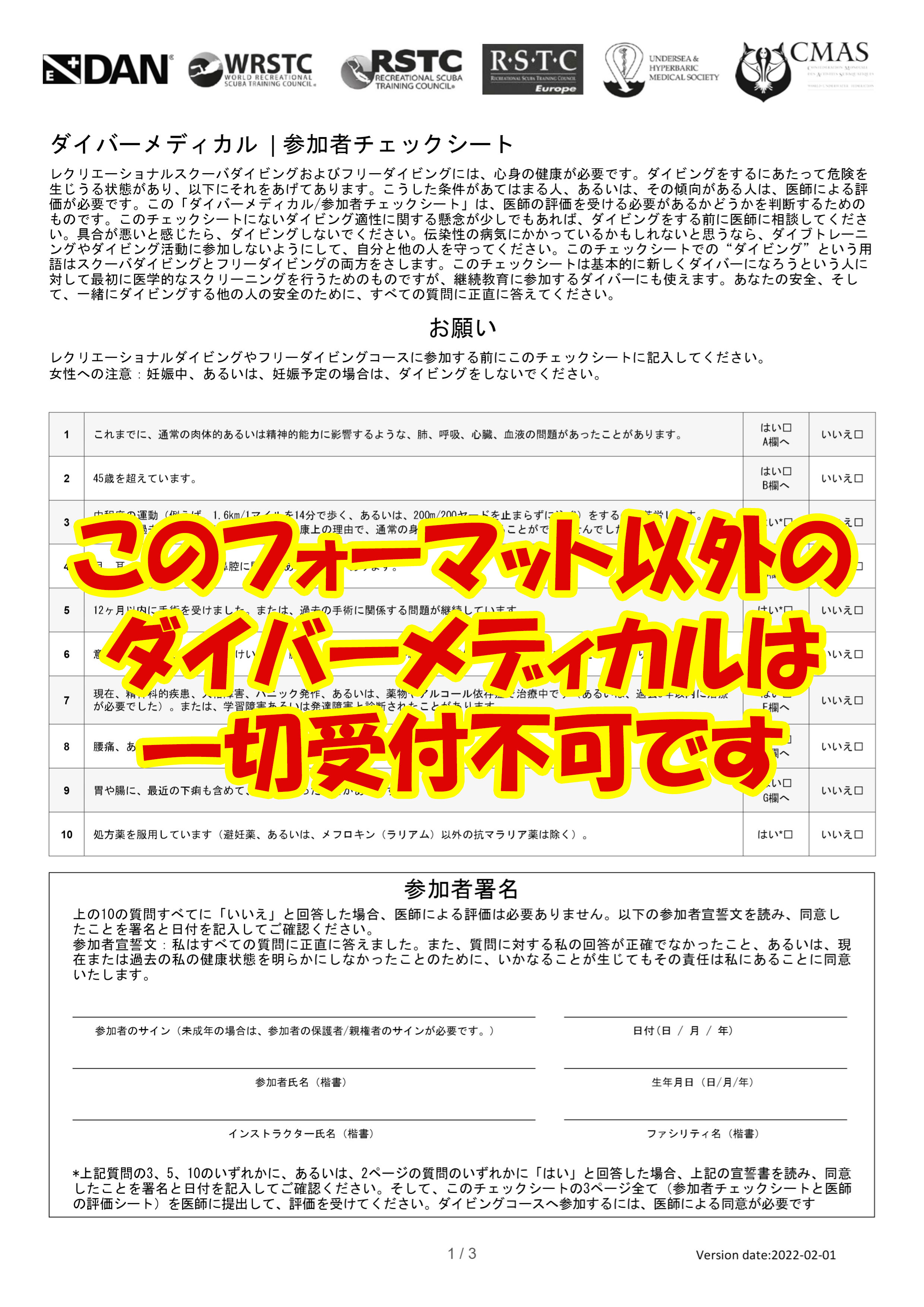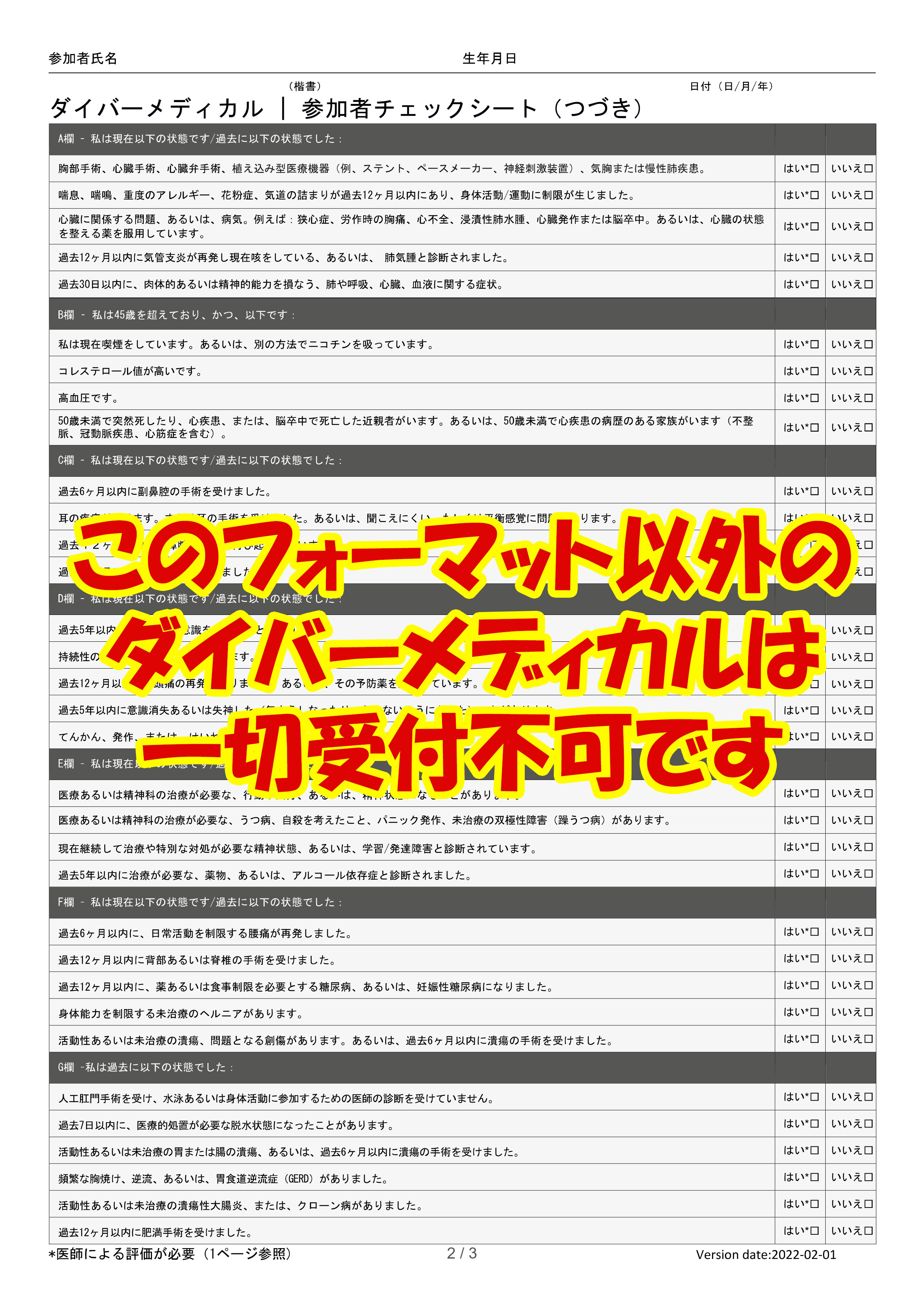 ダイバーメディカル/参加者チェックシートのみではダイビングの受付は出来ませんので予めご了承下さいませ。