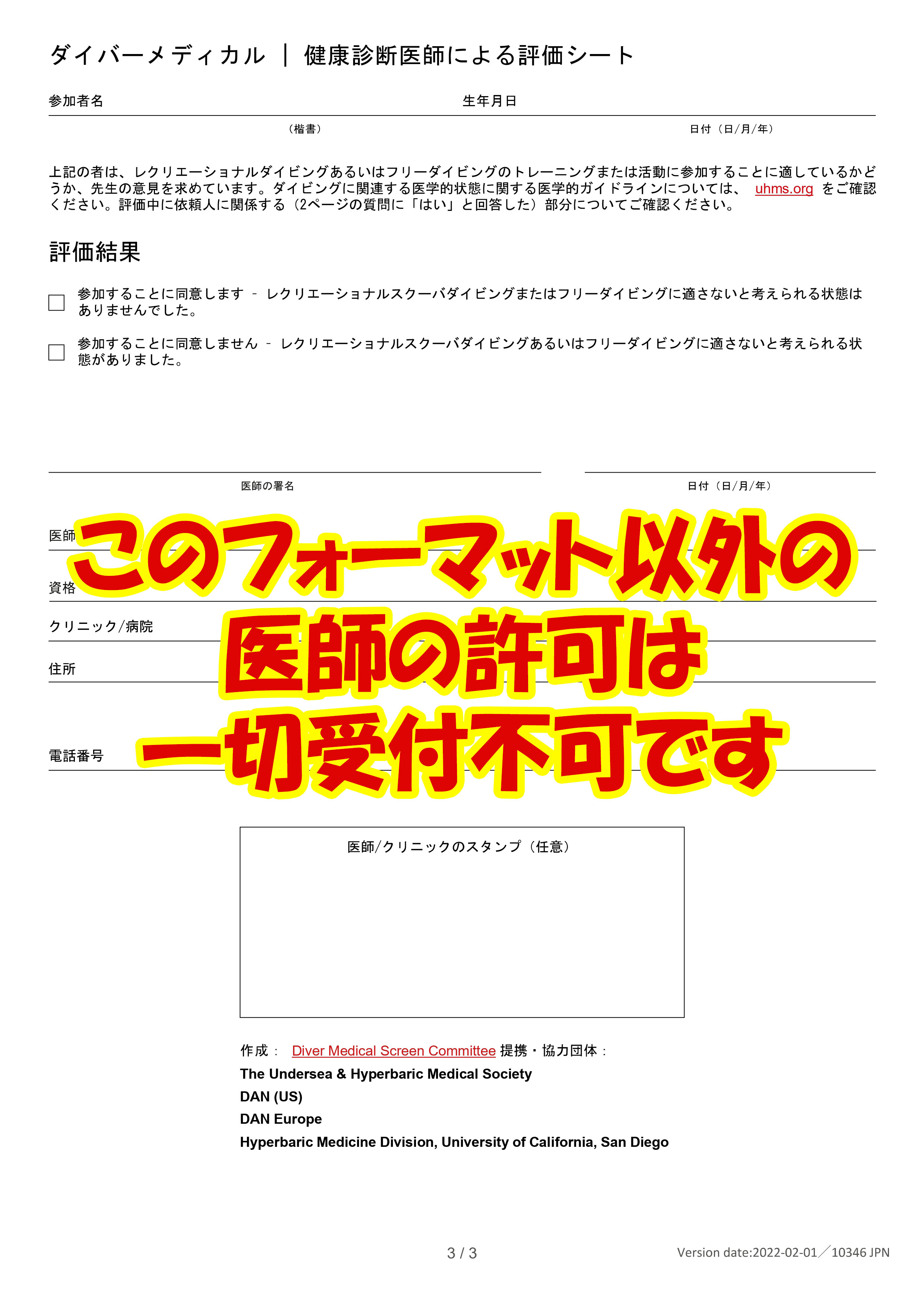 およびにダイバーメディカル参加者チェックシートを記入いただき、医師の許可が必要な項目に該当が何も無い場合においても、必ず内科を受診いただき、医師の許可(署名および押印)を必ず貰って下さい。